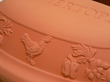I’ve admired these Römertopf clay bakers for years, but could never bring myself to fork out the $90 plus required to own one. So when Peters of Kensington had them on sale recently for $39, it wasn’t a hard decision to make. Well, it wasn’t hard for me, but Pete took some persuading, since our kitchen is bulging at the seams. This certainly is a bulky piece, but oh so very gorgeous.