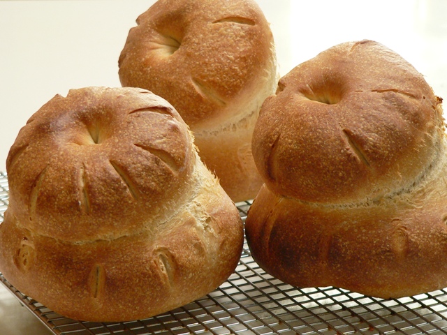 Immediately before baking, I slashed the loaves several times, to try and control the expansion and reduce the mushrooming effect. It was moderately successful and I finally ended up with three cottage loaves that I’m pretty happy with. Meet Larry, Curly and Moe…