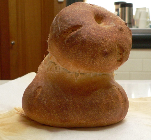 This is a very old traditional English bread shape – all bakeries made these when I was a kid. They don’t any more. I think the idea was that you ate the top one first and then the bottom one, so that it would keep fresher through the week. I don’t know if they were called cottage loaves because they look like a cottage with a roof on, or because they were made at home. I associate them with thatched cottages and so forth.