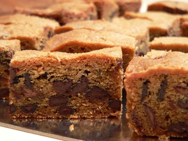 Gillian, I normally bake the butterscotch bars in an 8″ x 8″ pan, but this time I made a triple batch and divided it into two 9″ x 13″ pans. If you’re making them on a large scale, don’t try to do the whole lot at once – I made three consecutive batches, putting one batch in each tray and then dividing the last batch between the two trays. It takes a bit of work to smooth it in – I use wet hands. Oh, also, I like to keep the milk chocolate to less than 1/3 of the total chocolate, or it gets too sweet for me. I know you’ll understand the obsessive chocolate mind.. :)