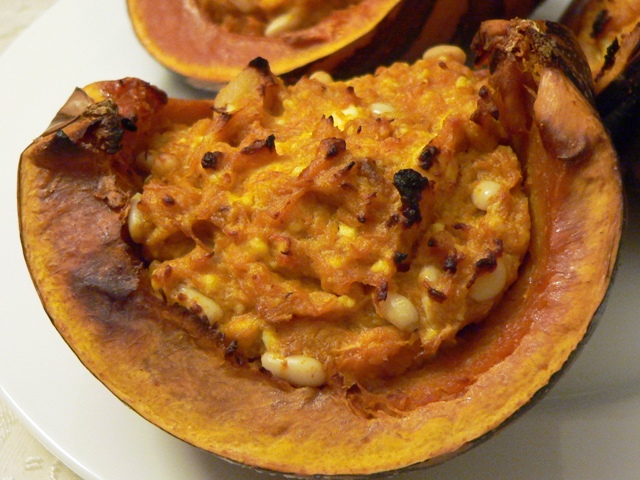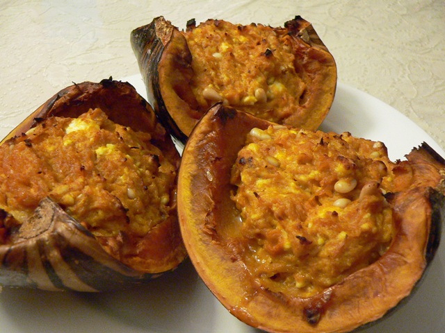 Scoop out the flesh of the pumpkin, leaving a 1cm border to hold the skin together, then mash it with a generous amount of feta cheese and pine nuts. Season well, then spoon the mixture back into the shells and bake them for another 15 minutes. Absolutely delicious and each quarter pumpkin is substantial enough for a meal in itself!