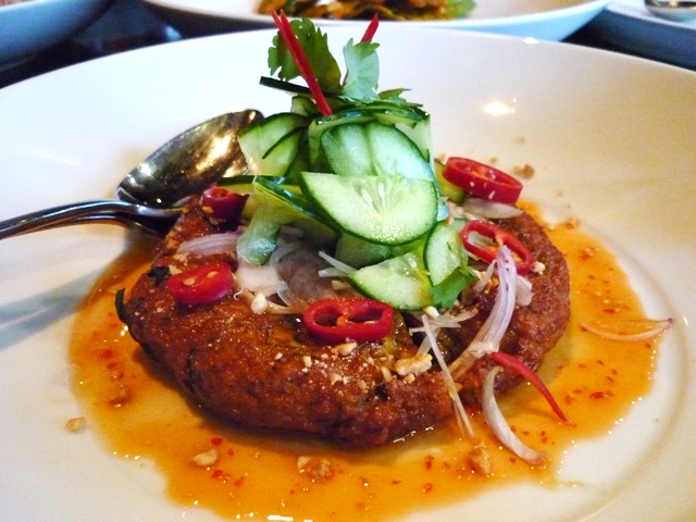 The meal began with Bour Tod, a prawn fritter served on a crispy betel leaf (pictured above) and Tod Man Pla, a deep fried fish cake (below). Deliciously different in both texture and flavour, even though both were served with crushed nuts and chilli sauce.