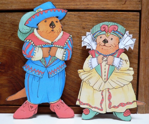 The Toymaker’s website also provides several paper doll patterns, with intricately detailed clothing. She has human figures, but also otters and groundhogs – here are her otters, Charles and Brook, dressed in their ball costumes.