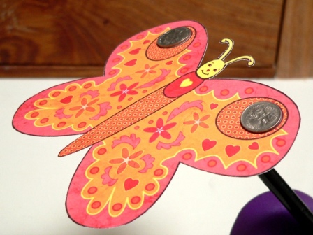 These “Penny Butterflies” (or in our case, 5c butterflies) balance on a point and flutter slightly in the breeze.