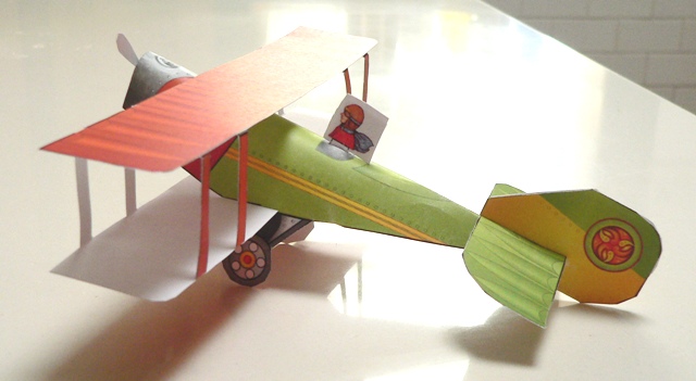 Small Man, who loves all forms of model building, spent the better part of an hour cutting and folding this fabulous cardboard biplane.