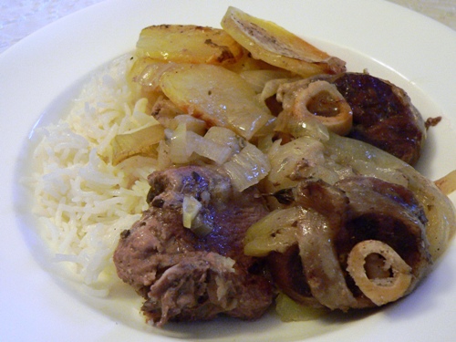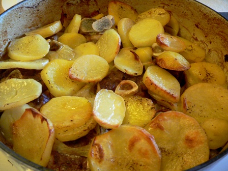 3. Brush melted butter over the base of a large casserole dish (I used a Le Creuset dutch oven) and arrange a layer of sliced potatoes. Top with a layer of lamb (both shank pieces and loin chops), then a layer of onions. Season well between layers with salt and pepper and a sprinkle of oregano (original recipe used thyme, but I didn’t have any).