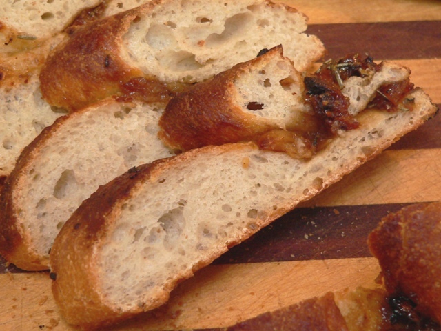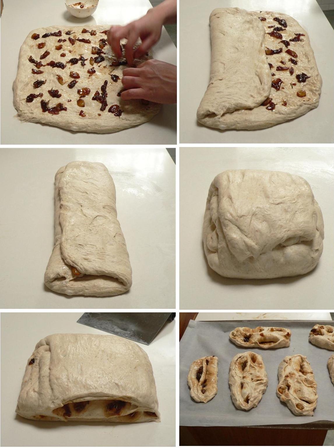 4. Add the balsamic vinegar, water, sugar, salt, pepper and rosemary and simmer for 5 minutes until the syrup reduces to a sticky caramel. Scrape the mixture into a small bowl to cool, then fold it into your prepared sourdough (or yeasted dough) as shown below. Enjoy!