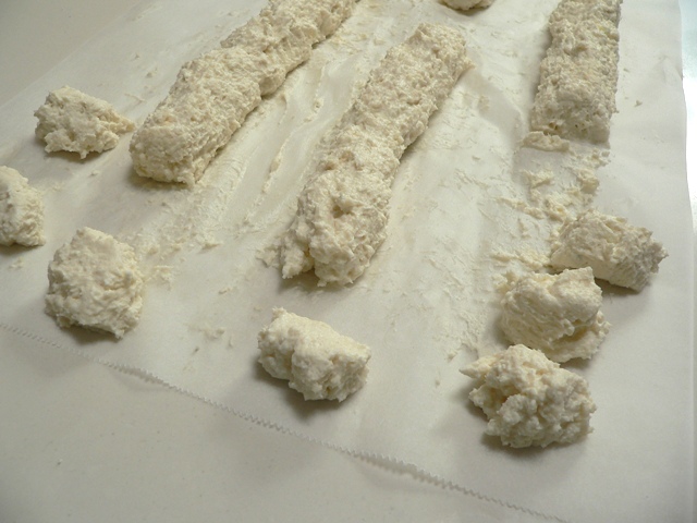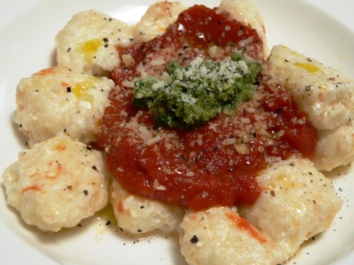 4. With a sharp knife, cut the logs into small dumplings, and drop them into the boiling water. Allow them to cook for about 45 seconds to a minute, or until they float to the surface. Scoop them out with a slotted spoon, and serve immediately with the sauce and a dusting of grated parmesan.