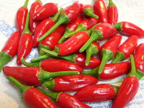 One of Pete’s plans for 2010 is to establish a permaculture garden in our small suburban backyard. My mum donated one of her chilli plants to start us off and, even though it’s still in a pot, this small shrub has fruited abundantly – here’s just a small portion of our harvest!