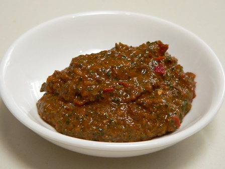 I turned the chillies into harissa sauce, using a recipe I put together years ago. It’s adapted from a recipe in Dave Dewitt’s A World of Curries, and is very simple to make, providing you have a food processor (I use a mini one). The quantities are pretty loose – use whatever you have on hand in amounts that suit your personal preferences.