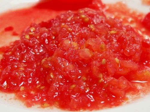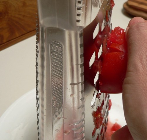 It’s a brilliant idea, and such an easy one – when you need tomato pulp in a hurry, and you can’t be bothered to blanch and then peel them, just shred the tomatoes through a large holed grater.