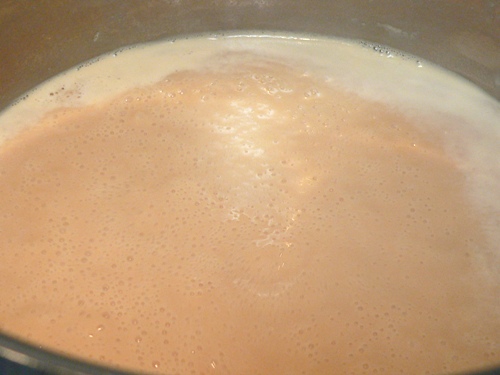 2. Boil until the milk changes colour and reduces in volume. The instructions here were a little vague, but we basically boiled the pot over a high heat until it had reduced by half, which took about an hour. Over that time, the colour gradually darkened to a light milk coffee shade.