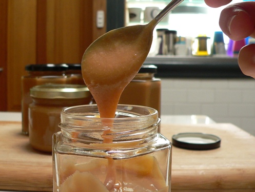 4. Once it starts to thicken, turn the heat down to very low, stirring frequently, until the dulce de leche turns a medium to dark caramel brown. It needs to be fussed over at this point, to ensure it doesn’t scorch and burn. The finished product is very hot (don’t ask me how I know) and has a thick pouring consistency. It will set up further as it cools. Total cooking time was about 2½ hours. Rebecca suggests that you stir in a few tablespoons of honey at this point, but Pete’s not a particular fan, so we left it out.