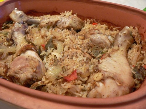 Last week we made a chicken biryani in the Römertopf, adding half a packet of purchased seasoning mix, some onion, garlic, tamarind and curry leaves. It was spicy, delicious, and just so easy.
