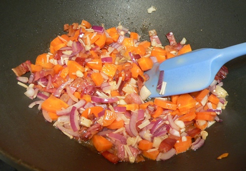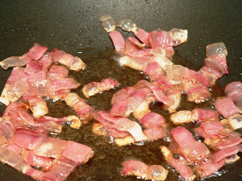 1. In a large frying pan or wok, heat up a vegetable oil with a high smoking point. Add the chopped pancetta and fry briefly to render the fat.