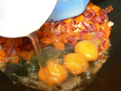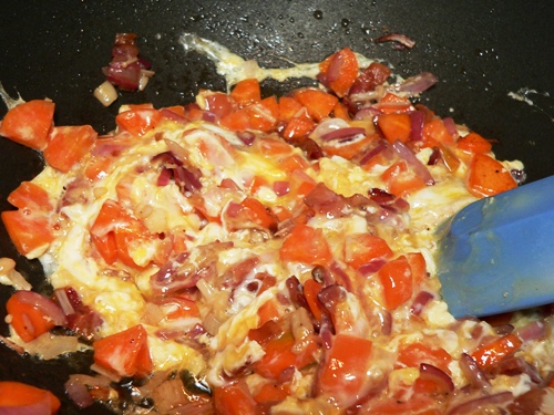 3. Push the vegetables to one side of the wok, and add the eggs. Some Chinese chefs work on the basis of one egg per person, but I just use whatever I have on hand. Scramble these a little, then mix them in with the rest of the ingredients.