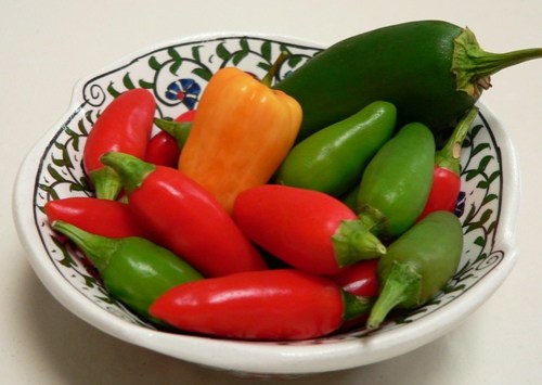 All of them are hot, the yellow habañero ridiculously so, and the red birdseyes not far behind. The green birdseyes are from a branch that we accidentally pruned off, and the large green one is from a shrub that I bought on spec from the markets.
