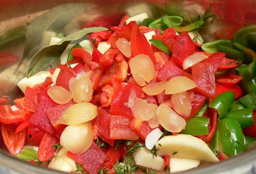 3. Place the chillies, capsicums, onions, garlic, apple and herbs into a large stock pot with 500ml water. Bring the pot to the boil, then reduce the heat and simmer for half an hour, adding more water if required.