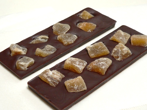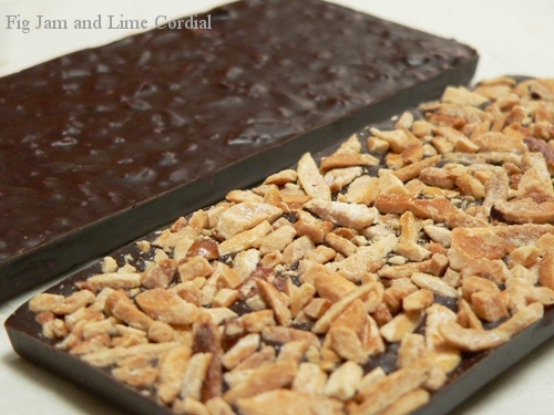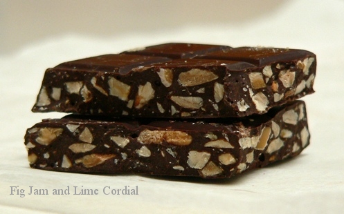So I’ve been experimenting – I started by making the roasted almonds, adapting the recipe I use for almond rochers. I tried scattering these over a tempered bar of 70% cacao, but found the chocolate too dark for the sweet almonds. I also discovered that encasing the almonds inside the bar gave a better mouthfeel and eating experience than using them as a topping.