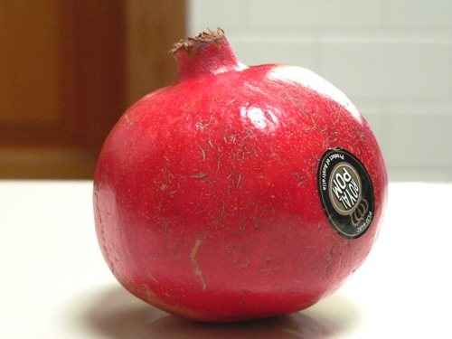 …is this ruby red pomegranate. When I mentioned to the Spice Girl that I’d entered a contest on Lorraine’s blog to win some of these, she arrived at my door with a glossy red globe in hand (I’ve actually won the giveaway too, thanks NQN!). I realise that I’m probably the last person in Australia to try a pomegranate. The little seeds resemble glowing red corn kernels, each bursting with sweet juice.