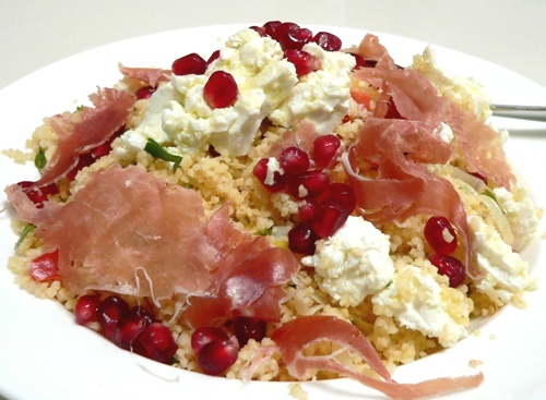 I managed to snap a photo of Big Boy’s lunch before he wolfed it – tabbouleh salad, topped with marinated feta, San Daniele prosciutto and pomegranate seeds…