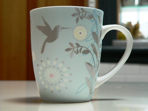 …is this beautiful bone china mug, a gift from our friends Chris and Andrea. It was impossible to capture how gorgeous this really is – the blue has a metallic sheen to it that’s lost in the photo. It’s part of the Maxwell & Williams Pink Ribbon range…