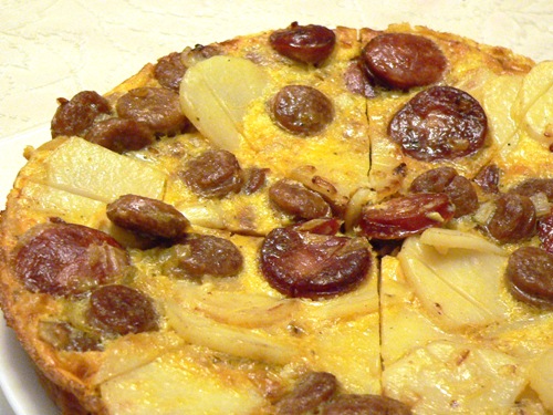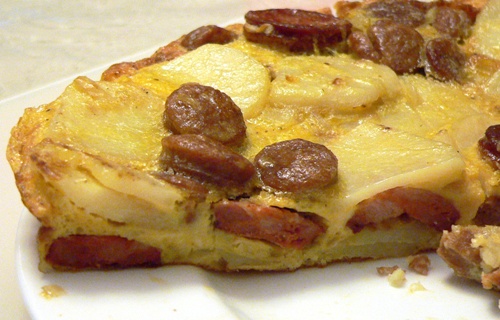 For dinner that same night, Pete made Dorie Greenspan’s Tortilha com Chourico; an easy, cream and cheese-free frittata filled with sausage and potatoes. We only had one chorizo, so Pete added four regular sausages as well, which had been boiled gently and sliced. A simple, yet delicious, evening meal and only one pan to wash up at the end of the night!