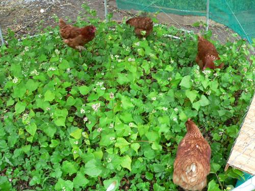 Yesterday, they had their first rotation – into a bed of buckwheat grown just for them. I thought you might like to see some photos of our happy ladies…
