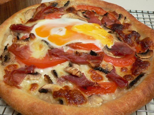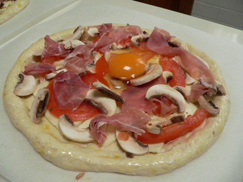 3. Cut the tomatoes in half, squeeze to remove excess juice, then slice. Top each pizza with sliced or grated mozzarella first, then with the tomato, sliced mushrooms and prosciutto. Finally crack an egg into the middle of the pizza, and break the yolk with a fork.