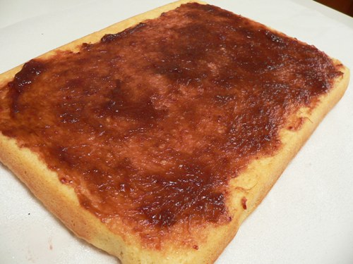 5. Spread a sheet of parchment paper with the extra caster sugar. Remove the baked sponge from the oven and turn it immediately onto the paper (be brave!). Remove the lining paper and spread the hot cake with warm jam.