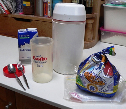 We purchased an Easiyo Yoghurt Maker, but this method will work with any suitably sized plastic thermos and jar, providing it can keep the milk warm for 8 – 12 hours.