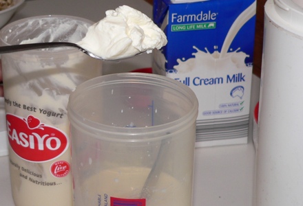 Traditionally, yoghurt is made from milk which has been boiled first to sterilise it, then cooled to room temperature. We sidestep that process by using long life (UHT) milk, which has been ultra-heat processed. In order to ensure it remains sterile, we always open a new carton for each fresh batch of yoghurt.