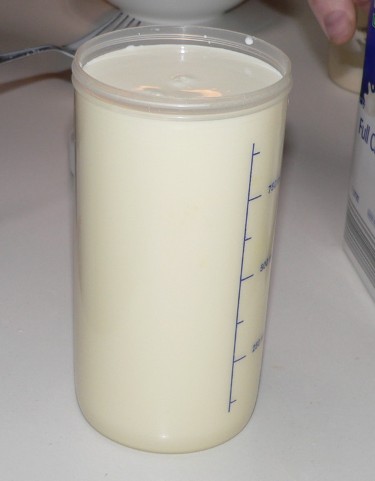 Step 1 : Fill the 1 litre jar half full with milk. Add the full cream milk powder and stir vigorously with a fork.