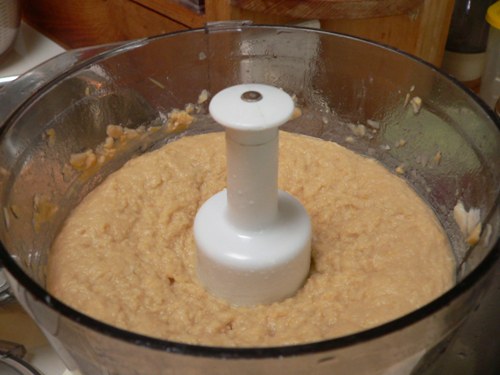Rinse and drain the chick peas, then load them into the bowl of a large food processor with a clove or two of coarsely chopped garlic. Turn the machine on, then add hot or boiling water slowly through the chute until the mixture blends to an almost smooth paste (photo below).