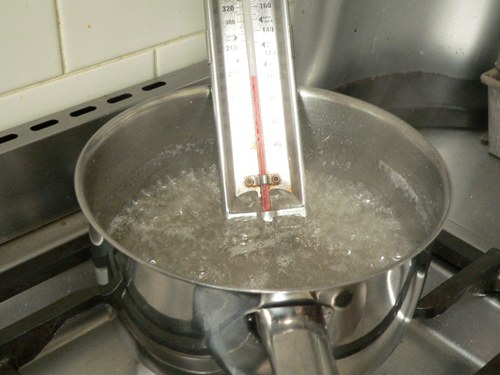 2. In a medium saucepan with a long handle, stir the sugar and water over a low heat until the sugar dissolves, then raise the heat and bring to a rapid boil. Clip on a candy thermometer and boil the syrup until it reaches hard ball stage (122C/252F). This will take approximately 10 – 15 minutes.