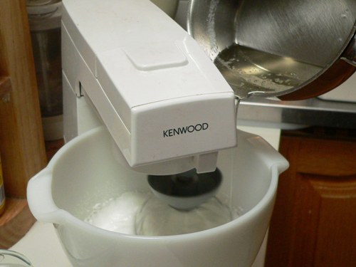 5. Once the syrup is at the right temperature, remove the saucepan from the heat. Turn the mixer on to low, and gently trickle the hot syrup into the stiff egg whites, beating constantly as the mixture turns creamy. Please be very careful – the sugar syrup is blindingly hot!