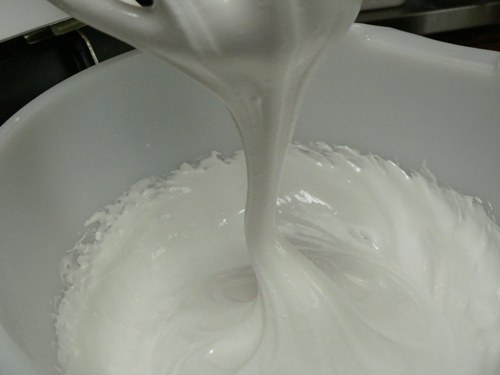 4. Before the syrup reaches temperature, place the egg whites in the bowl of a sturdy stand mixer and beat until stiff peaks form. Timing is quite important, and the sugar syrup, egg whites and gelatine need to be ready at the same time. It helps, but isn’t essential, to have two people on the job – one to watch the syrup thermometer and the other to prepare the other ingredients.