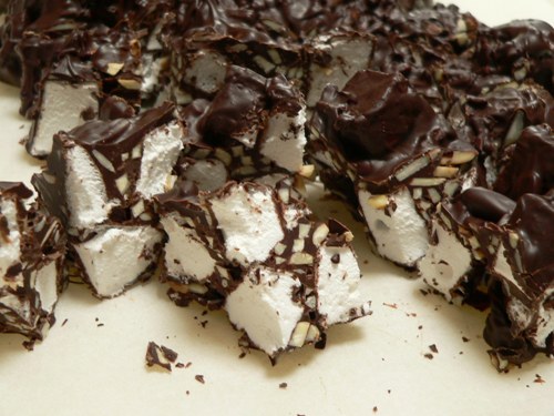 Heidi, I’ve decided I don’t like all the other bits in commercial rocky road – no pink marshmallows, no dried fruit. I just want dark chocolate, marshmallows and a white nut – almond, brazil or macadamia.