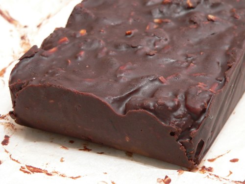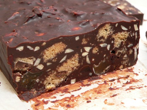 The original recipe is attributed to Konditor & Cook, a well known London bakery. I’ve adapted it to use date molasses rather than golden syrup, leftover homemade cookies instead of packaged ones, and added the fruit and nuts I had in the pantry. The end result is delicious and very rich, so best served in thin slices. This is a great recipe to play with – take the basic idea and then do whatever you like with it!