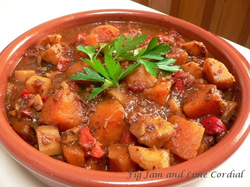 Last night’s dinner was perhaps the best to date. We began with Ottolenghi’s two potato vindaloo, a tasty combination of sweet and waxy potatoes, tomatoes, capsicums and shallots, flavoured with an array of spices.