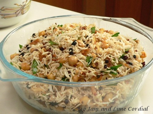 This was paired with a new rice dish from the Guardian website. Instead of mixing wild rice and Basmati as specified, we substituted smoked rice that we’d purchased a few months ago in Marrickville. The flavours matched the vindaloo perfectly. It was simple to construct – drained tinned chick peas and spices were fried briefly, and then combined with the cooked rice, currants, herbs and fried onions.