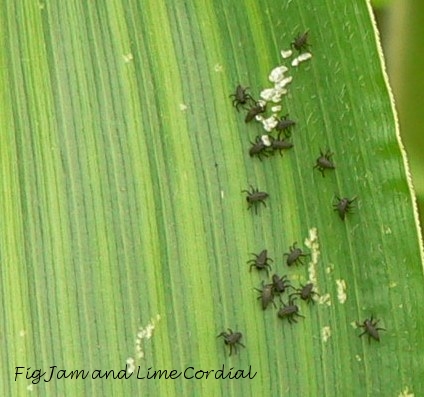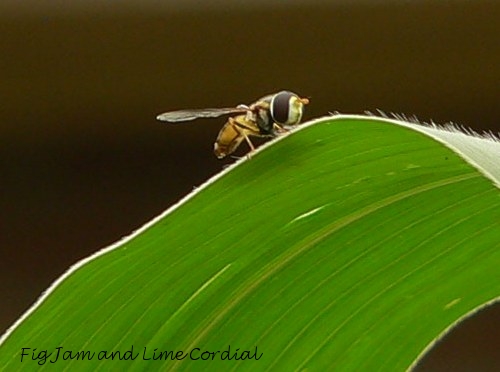 This little beauty is a hoverfly, and I think it alighted on the corn stalk simply to pose for a photo, because I’ve never seen one land before. Its larvae eat aphids and other small pests.