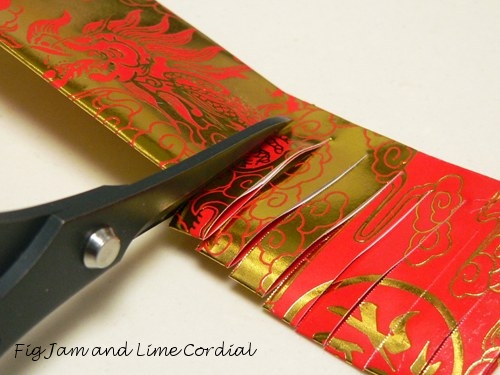 Fold the wrapper in half lengthways. With a sharp pair of scissors and cutting from the folded edge, snip into even strips, cutting almost to the edge.