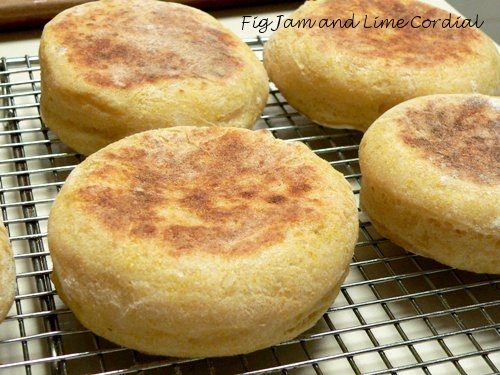 …are cornmeal English muffins, made to a modified Dan Lepard recipe. On Joanna’s advice, I reduced the water in the recipe from 425ml to 300ml. The slightly drier dough cut well and held its shape in the frying pan…