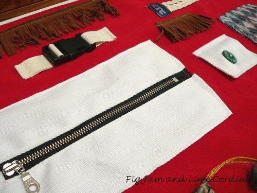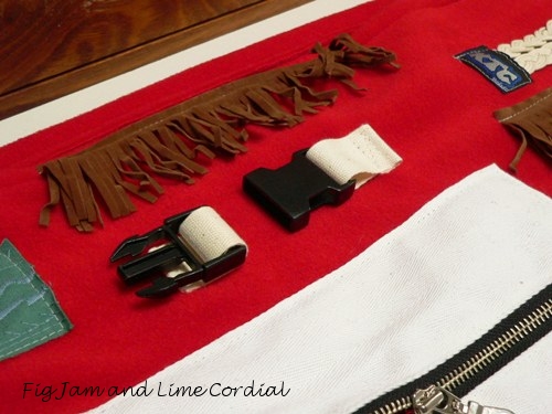 In this larger piece, I’ve sewn bits and pieces (found in my sewing room) onto the upper edge of the blanket. The base is made of red polarfleece, which is both warm and lightweight. I’ve tried to work in a combination of elements that allow “doing” with some that are designed just for “touching”.