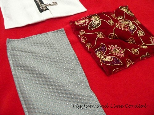 On the tactile front, I’ve sewn in a patch of non-slip fabric, originally bought for the soles of baby shoes (which goes to show how long it’s been in my sewing room), and a patch of embossed velvet. For added interest, I’ve sewn a small triangle into the velvet, and trapuntoed it from the back to create a little raised pillow…