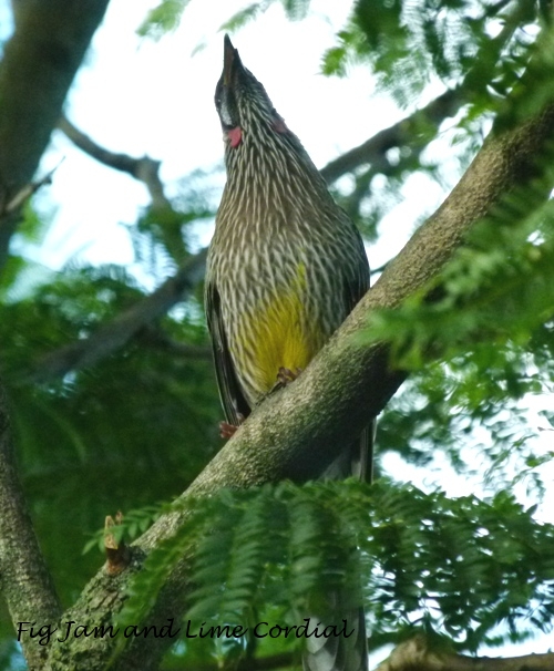 I have to confess though, it was a very unsophisticated shot. I have a mid-range Lumix FZ100 with a fixed lens. I’m quite short-sighted, so when Pete and his brother Steve saw the bird, they called out to me, and I tried to find it in the viewfinder – it was up really high on a branch. And then I just clicked as many photos as I could before it flew away. I think I must have taken 30 photos to get the ones in the post. I was particularly pleased with the one where the bird is calling – I’ve never seen another Wattlebird photo like that!