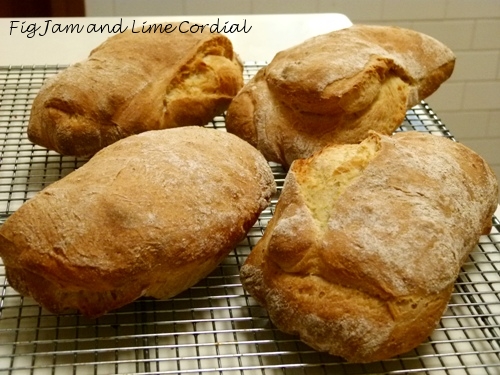 …are four loaves of homemade sourdough ciabatta, our new pane de casa, or house bread. Small Man is eating like a horse at the moment, and will demolish a loaf a day, before and after dinner. Thankfully, it’s the simplest bread I make…