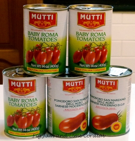 Thankfully, my mate Johnny at the cheese shop has started stocking the fabulous Mutti range of Italian tomatoes and sauces. Ignoring all my BPA concerns, I’ve stocked up on two types – the baby romas, and the San Marzano. The latter are quite expensive ($3/tin), but ever since we’ve bought them, Pete has refused to use anything else. Sigh…