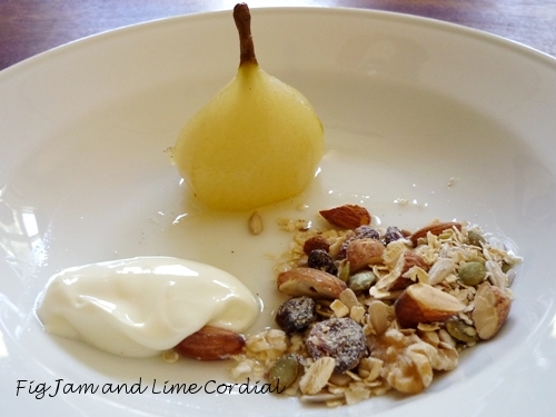 Oh my, breakfast looks awesome! I especially like the poached pear with the muesli and yogurt. Do you by chance have a recipe for homemade muesli?